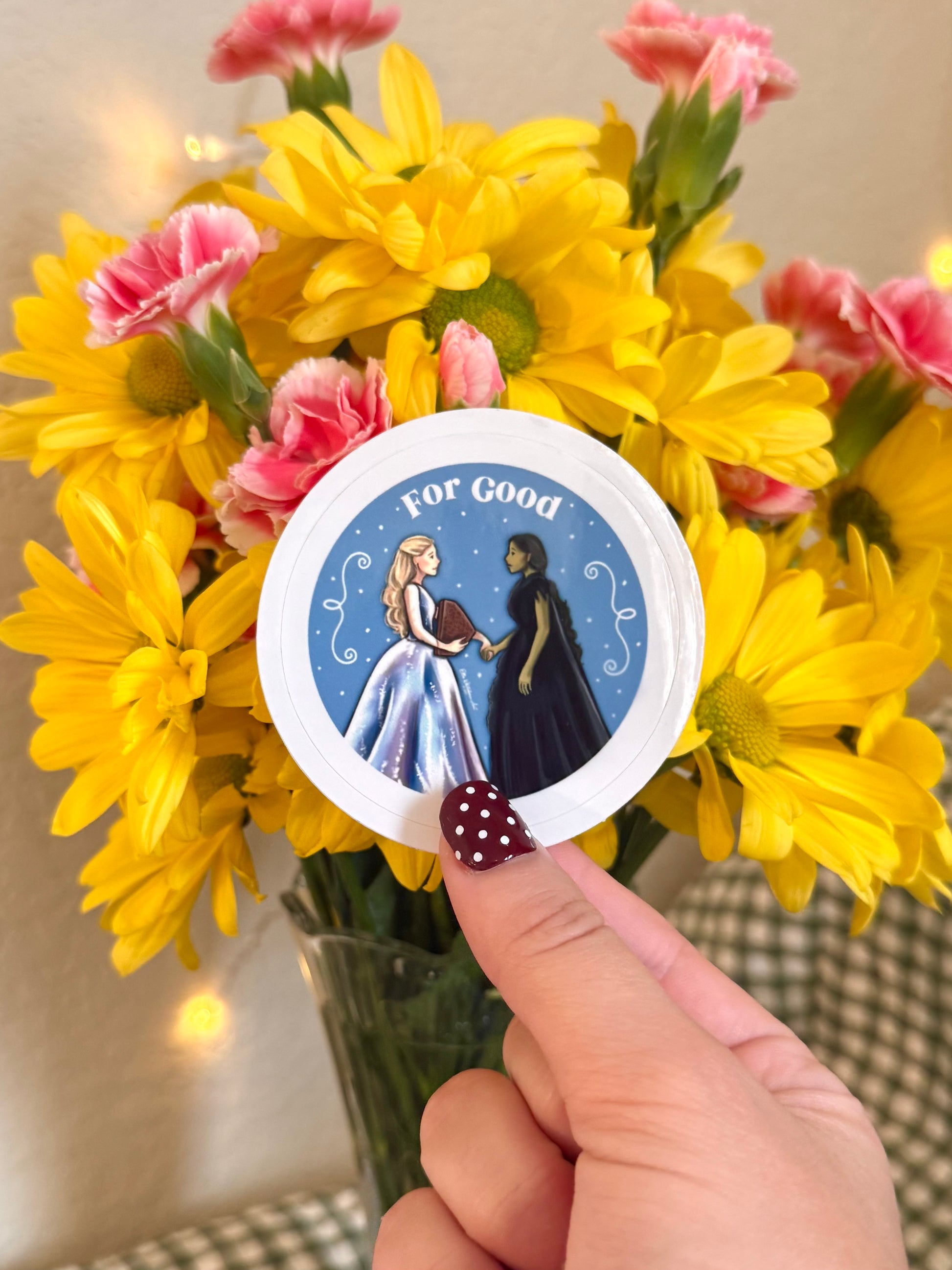 Celebrate the iconic friendship of Elphaba and Glinda with this charming sticker! Inspired by the beloved Wicked musical, this sticker features a heartwarming illustration of the green-skinned witch in black and her pink-clad bestie, symbolizing that opposites do attract.